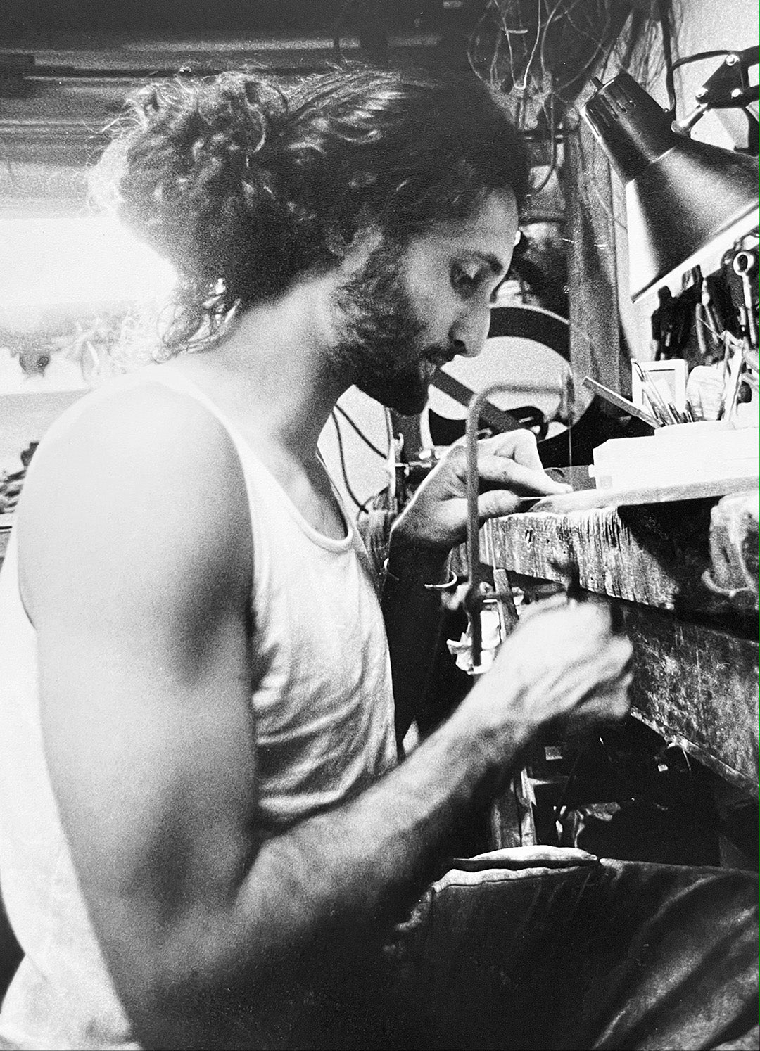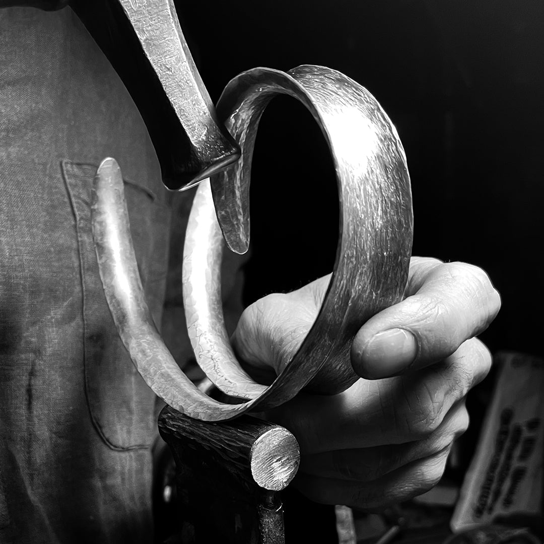 "L'Enlacée" est fabriquée en Toscane, son bijoux est fabriqué sur commande, martelé sur mesure dans l'atelier d'Elie Hirsch en Bourgogne.