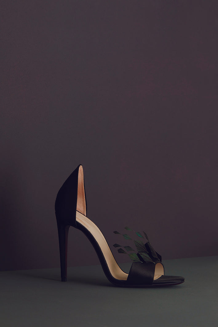 Sandale en satin noir au talon aiguille de 10cm ornée de plumes naturelles demi-bronze, teintées, taillées et brodées à la main.
