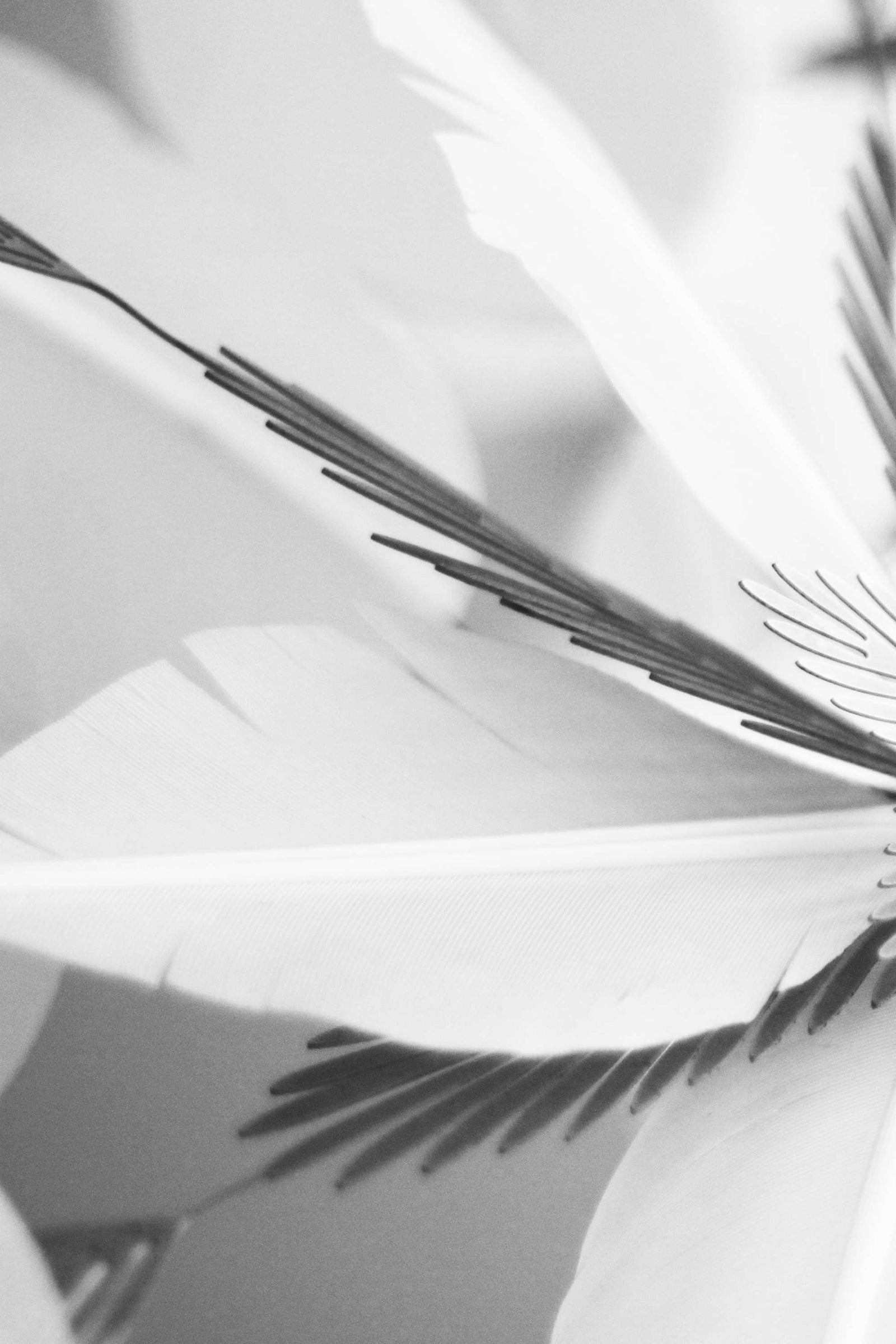 Dans l’atmosphère calme et studieuse de son atelier naissent beaucoup d’envies : travailler le volume, le tissage d’une plume de paon… Nous échangeons, nous essayons. Janaïna, munie de ses ciseaux et de ses plumes, coupe, assemble, dessine.